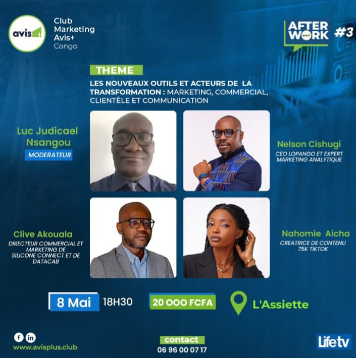 Le Club Marketing Avis+ Congo vous donne rendez-vous pour la 3ᵉ édition de son After Work, un moment privilégié d’échanges et de réflexion autour du thème : « Les nouveaux outils et acteurs de la transformation : marketing, commercial, clientèle et communication ».