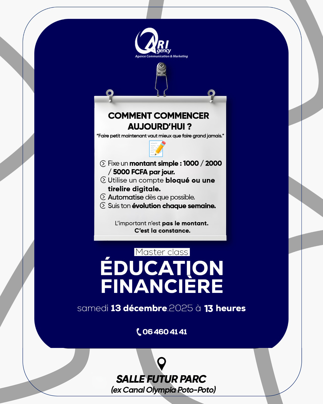 Le 13 décembre 2025, Brazzaville a accueilli une master class exceptionnelle sur l’éducation financière, organisée par ARI Agency, agence spécialisée en communication et marketing. L’événement, initialement prévu à la Salle Futur Parc, s’est déroulé au Mémorial Pierre Savorgnan de Brazza, offrant un cadre prestigieux et inspirant aux participants.
