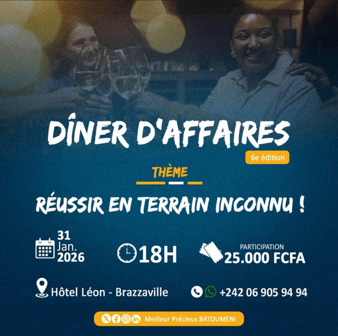 Le Dîner d’Affaires revient pour sa 6ᵉ édition, offrant un cadre unique pour réseauter et échanger avec des professionnels et entrepreneurs à Brazzaville. Sous le thème « Réussir en terrain inconnu », les participants découvriront des stratégies et conseils pour exceller même dans des environnements inconnus.