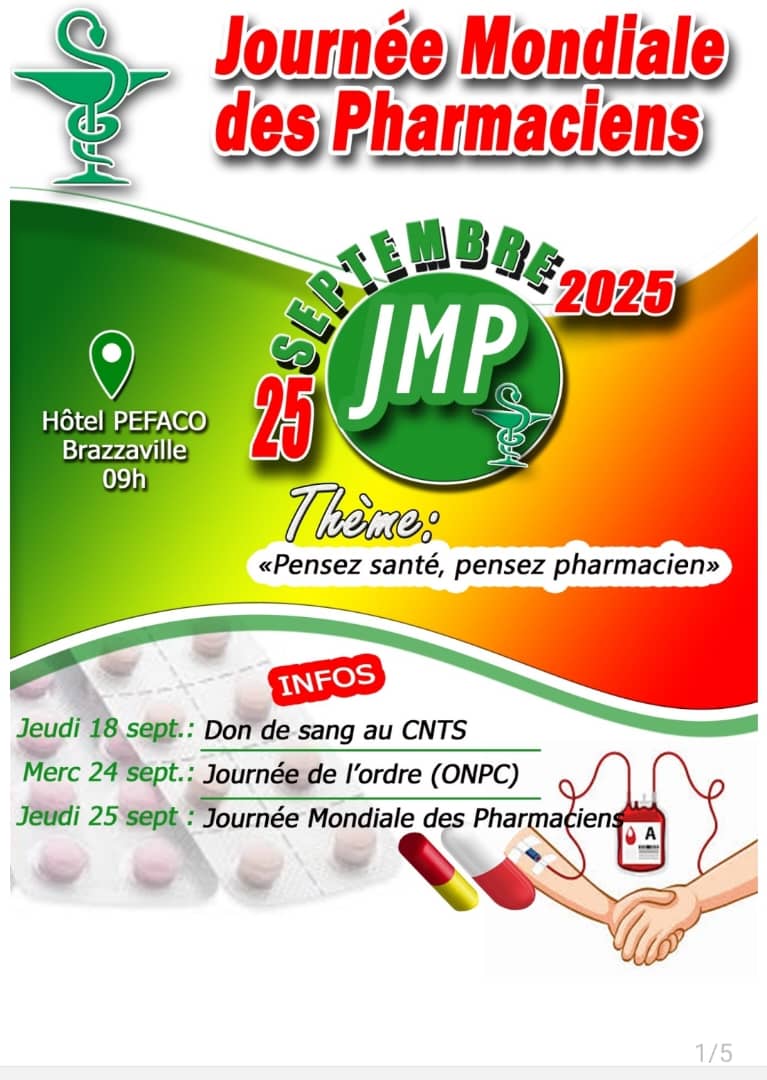 Le 25 septembre 2025, les pharmaciens se réunissent à Brazzaville pour la JMP. Thème : « Pensez santé, pensez pharmacien ». Rendez-vous à 09h à l’Hôtel PEFACO.